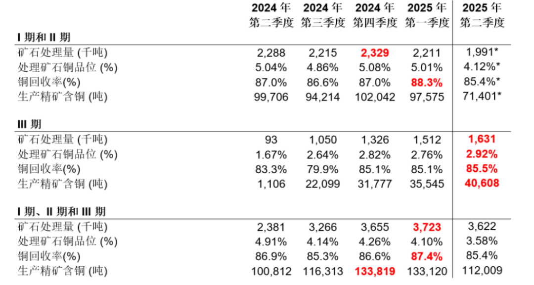 卡莫阿-卡库拉铜矿的卡库拉矿段因多次矿震导致部分井下采矿暂停,受到一定冲击。2025年第二季度,卡莫阿–卡库拉 I 期、II 期和 III 期选厂共处理362万吨矿石,产铜11.2万吨,同比增长11%,但环比降低-15.86%。
