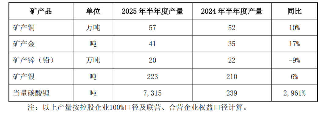 2025年上半年,紫金矿业矿产铜产量57万吨,同比增长10%;矿产金产量41吨,同比增长17%;矿产锌(铅)产量20万吨,同比降低9%;矿产银产量223吨,同比增长6%;当量碳酸锂产量7315吨,同比增长2961%。